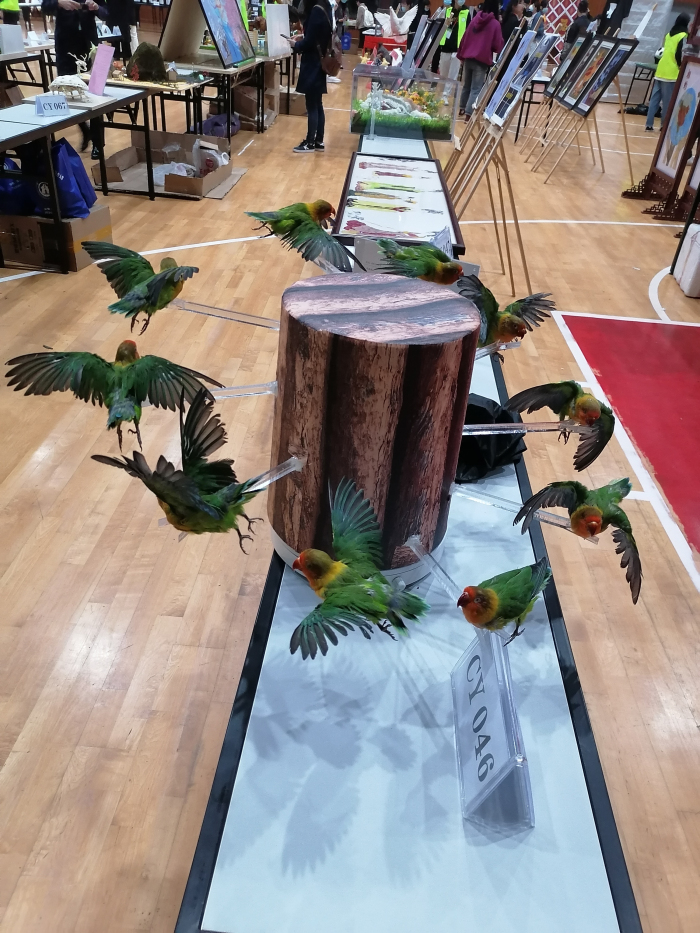 我校选送的8件作品,立意新颖,制作精美,工艺精湛。选手们经过作品展示、陈述讲解,再到决赛答辩的激烈比拼,最终取得了优异成绩,共获得一等奖2项、二等奖3项、三等奖1项。其中展现鸟类降落的动作过程,并将其定格为10个瞬间的作品“鹉态生风”和作品“鸟类头骨、下肢骨分类教学标本”荣获一等奖;二等奖3项,分别是作品“铁甲勇士”、“鞘翅目昆虫环氧树脂教学标本”和“大别山植物鉴赏”;作品“鹦落枝头盼晨曦”获得三等奖。我校学生在此次安徽省大学生生物标本制作大赛中表现优异,成绩位省内前列。