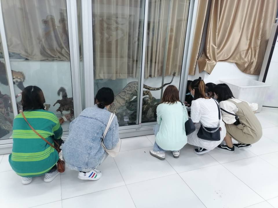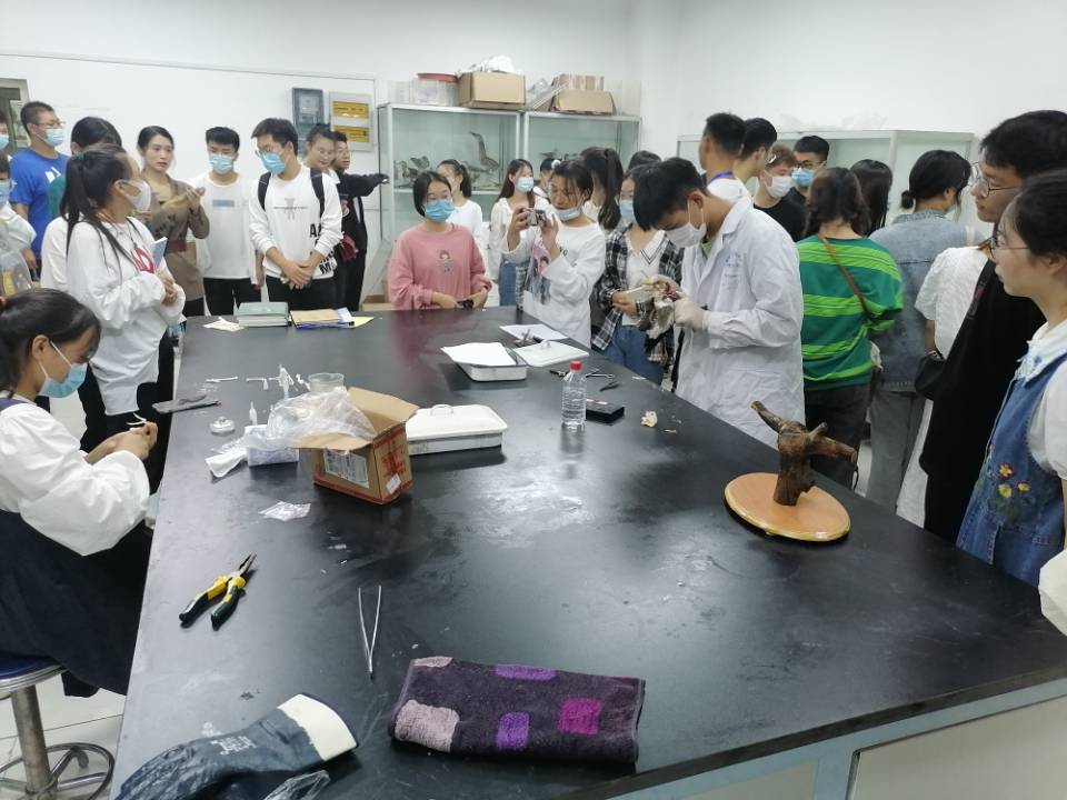 参观标本陈列室后,讲解员带领阜阳幼儿高等专科学校师生转至生物标本制作室,现场观摩动物学实训中心成员制作剥制标本、骨骼标本、琥珀标本。在观看标本制作过程中,阜阳幼儿高等专科学校的师生们情绪高昂,并对生物标本的制作展现出浓厚的兴趣。(撰稿、图片:李永民、杜盼;学院审核:刘勇)