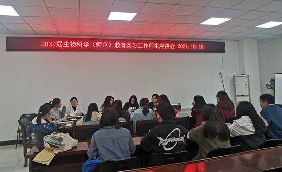 为加强教育实习的过程监控与管理,提升师范生培养质量,巩固学校实践育人特色,生物与食品工程学院于10月18日下午召开了2022届生物科学专业教育实习工作师生座谈会,生物系主任任莉萍、教育实习负责人杜召凤、相关实习指导教师以及各实习小组学生代表参加会议。会议由杜召凤主持。