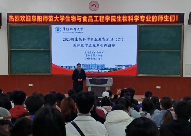 教育见习是师范专业人才培养过程中重要的实践性教学环节,也是提高师范生综合素质与技能的重要途径之一。生物与食品工程学院于第十二周开展(11月15日-11月21日)教育见习实践活动。2021年11月15日下午,曹小汉、许树成、范可章三位老师带领2020级生物科学专业学生来到阜阳市第三中学开展见习,并聆听了阜阳三中徐新河老师和郭静静老师有关教师教学流程与管理以及“三字一话”与教师专业成长的讲座。