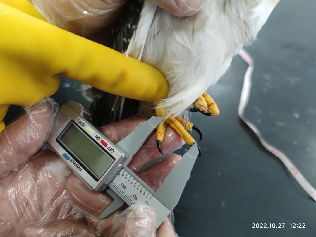 实训中心师生对其受伤部位进行消毒包扎处理,并测量其身体各项指标进行记录,经测量其体重为182.5g,体长30cm,翼展83.5cm,为黑翅鸢亚成体。
