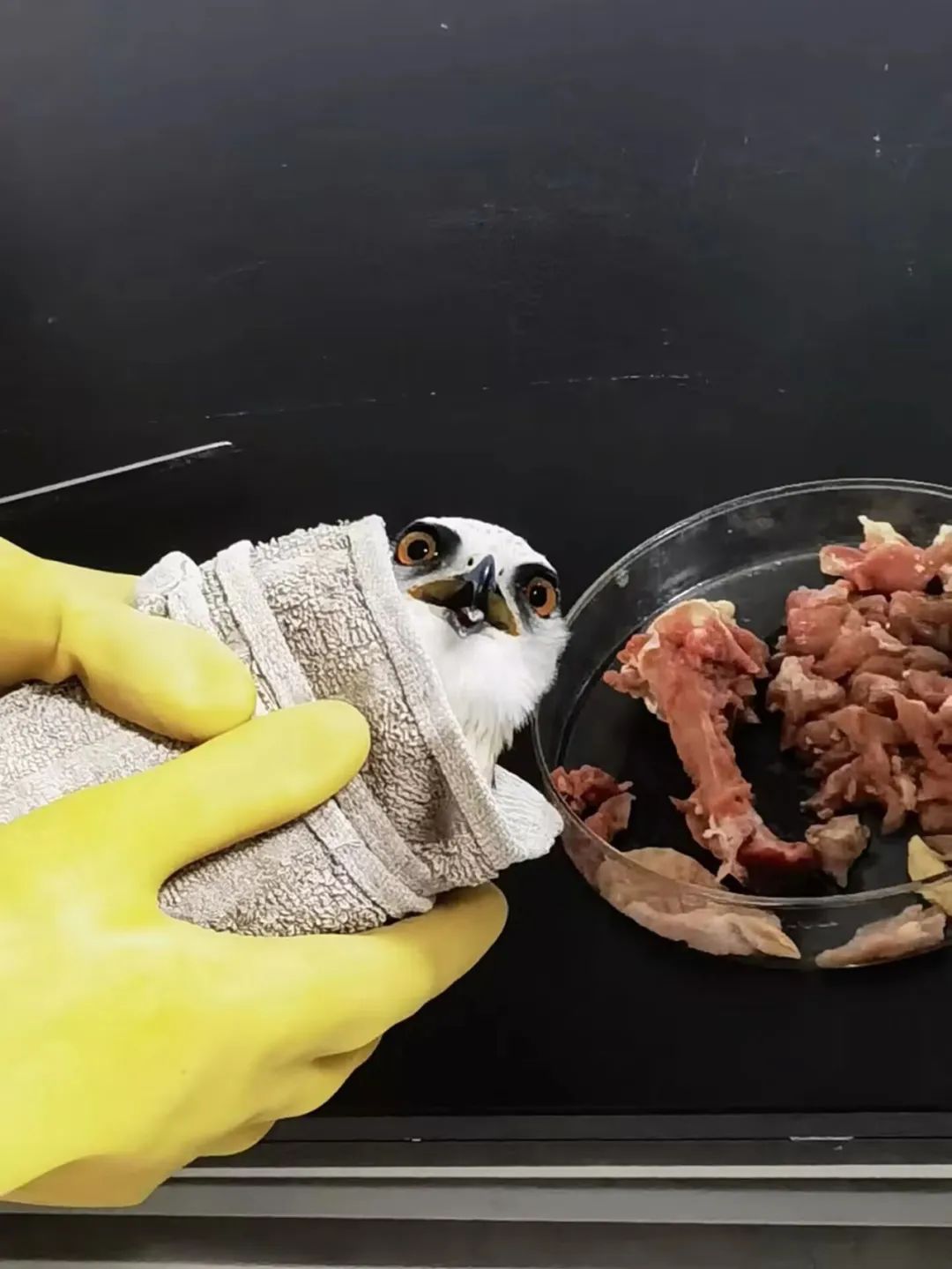 实训中心师生在实验室中对其精心照料,期间喂食新鲜鸡肉、纯净水。