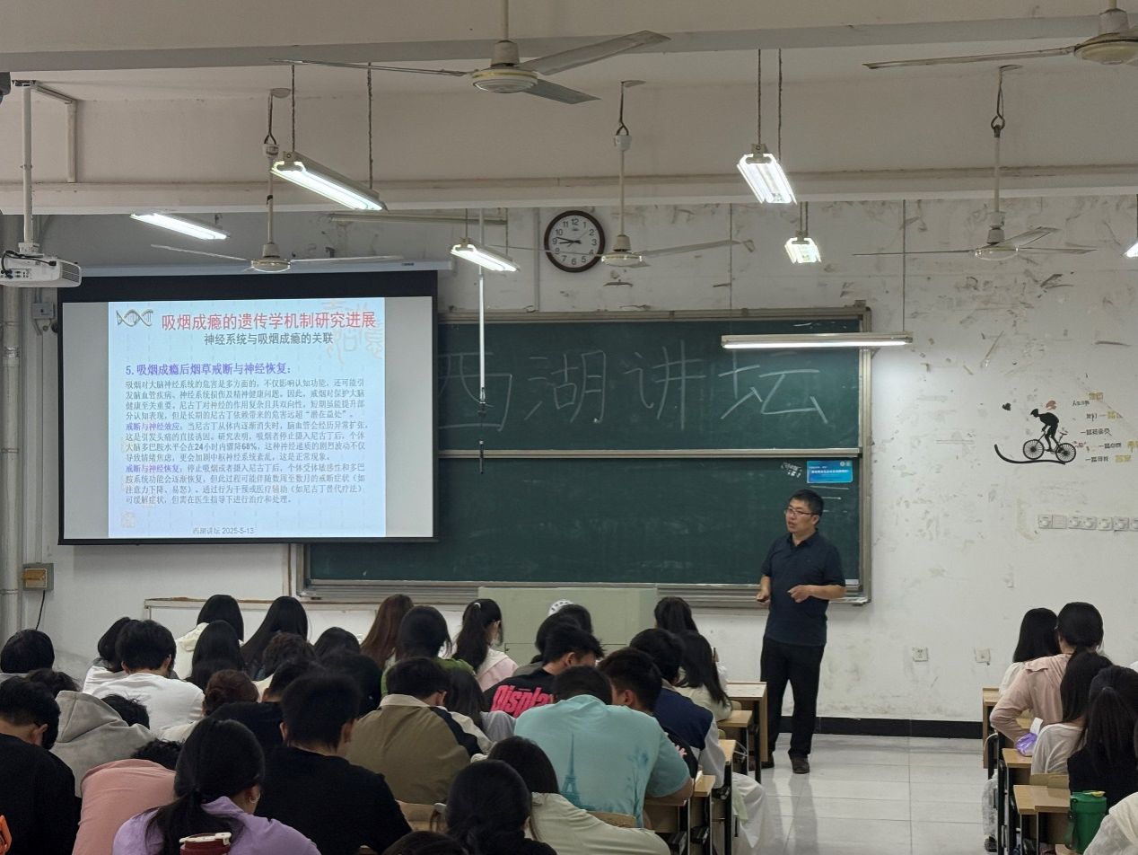 5月13日上午8:00-10:00,由科研处主办、生物与食品工程学院承办的2025年度“西湖讲坛”在西湖校区躬行楼D楼205举办。生物与食品工程学院三级教授刘武艺博士作了题为“吸烟成瘾的遗传学机制、影响因素和戒烟策略及康复治疗管理”的学术报告。报告深入探讨了不同人群吸烟成瘾机制研究的最新进展、已有遗传学证据、分子诊断技术、吸烟成瘾的影响因素和戒烟策略以及康复治疗管理的创新方向,为与会者呈现了一场高水平的学术盛宴。全校有近120名感兴趣的师生参会。