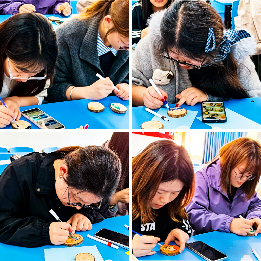 活动现场,同学们满怀热忱投入创作,围绕清明文化内涵与生命安全主题,认真构思、精心设计每一款木质冰箱贴。从图案勾勒到色彩搭配,从细节打磨到整体成型,大家以笔为媒,勾勒心中追思;以手为桥,雕琢青春心意,将对生命的感悟与自身的创意巧思,尽数融入每一件作品之中。沉浸式的手工体验,不仅有效舒缓了同学们日常学习生活的压力、放松了心绪,更让大家在动手实践中,深刻体悟清明“慎终追远、礼赞生命”的深厚文化内核,在静谧的创作时光里思考生命价值,汲取积极向上的成长力量。
