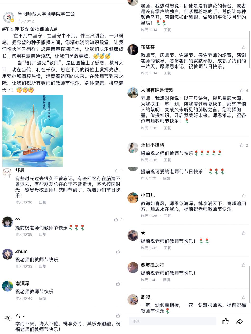 三寸粉笔,三尺讲台系国运;一颗丹心,一生秉烛铸民魂。金秋9月,在欢庆第38个教师节来临之际,为进一步感谢老师们的辛勤付出和谆谆教诲,我院学生通过开展系列送祝福活动向老师们深切表达感恩之情。