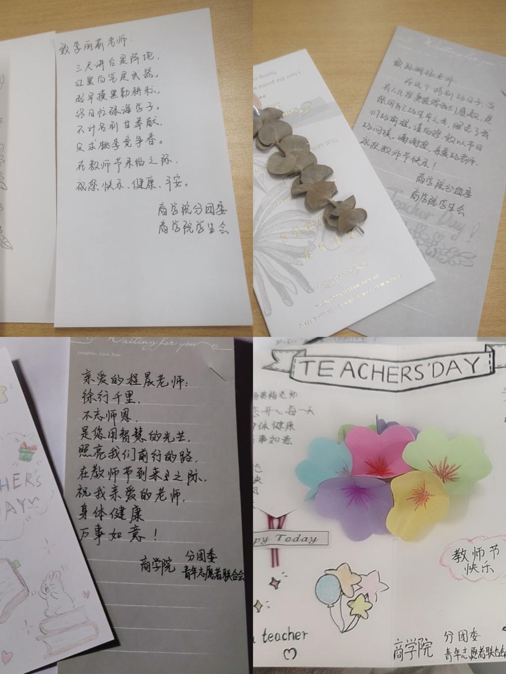 方寸心里话,言语寄真情。9月初,商学院学生会面向全体学生开展线上“老师,我想对您说”主题留言、线下征集教师节明信片活动。活动迅速在全院范围内掀起参与热潮,同学们争先留言、认真准备明信片。“心怀皓月,致敬师恩;秋水蒹葭,不忘师恩。”“以风雨润桃李,黑白画春秋。”“云山苍苍,江水泱泱,先生之风,山高水长!”……天涯海角有穷时,唯有师恩无尽期。在这个特殊的日子里,一句句浓情满满的心里话,一张张充满意境的明信片,情真意切表达了我院学生对老师们的诚挚祝福。