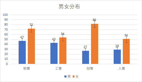 男女数量差异最大和最小的专业分别是财务管理专业(男生27人, 女生82人)和工商管理专业 (男生43人, 女生54人)。