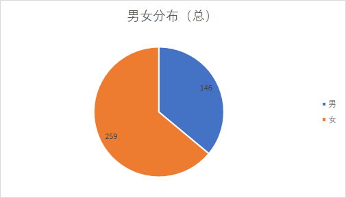 今年,我院一共迎来了405名新同学。其中,男生有146名,女生有259名,男女比例1:1.77。