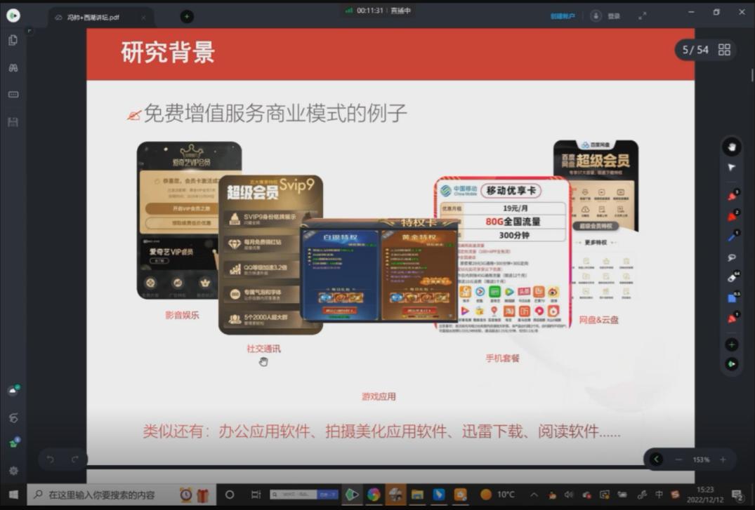 12月12日下午,由科研处主办,我院承办的2022-2023学年第一学期“西湖讲坛”通过腾讯会议的方式举行,本期讲坛由我院副教授冯帅博士以“Freemium免费增值商业模式的有效性研究”为主题进行主讲。商学院研究生、各专业本科生及部分教师在线参加了本次讲座,并参与了线上交流与讨论。