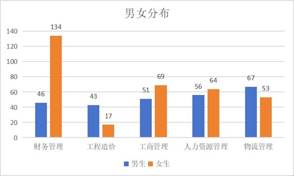 男女数量差异最大和最小的专业分别是财务管理(男生46人, 女生134人)和人力资源管理专业 (男生64人, 女生56人)。
