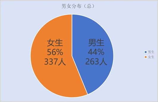 男女比例知多少。今年我院共迎来600名新生,其中女生337人,男生263人,男女比例1:1.28。