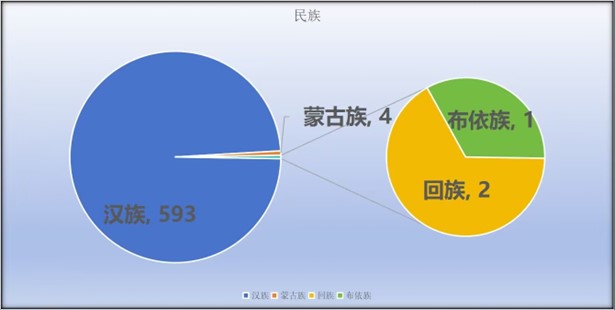 各个民族心连心,同心共筑商学院。2023级新生们共来自4个民族,其中汉族有593人,少数民族有7人,分别是回族(2人)、蒙古族(4人)和布依族(1人)。