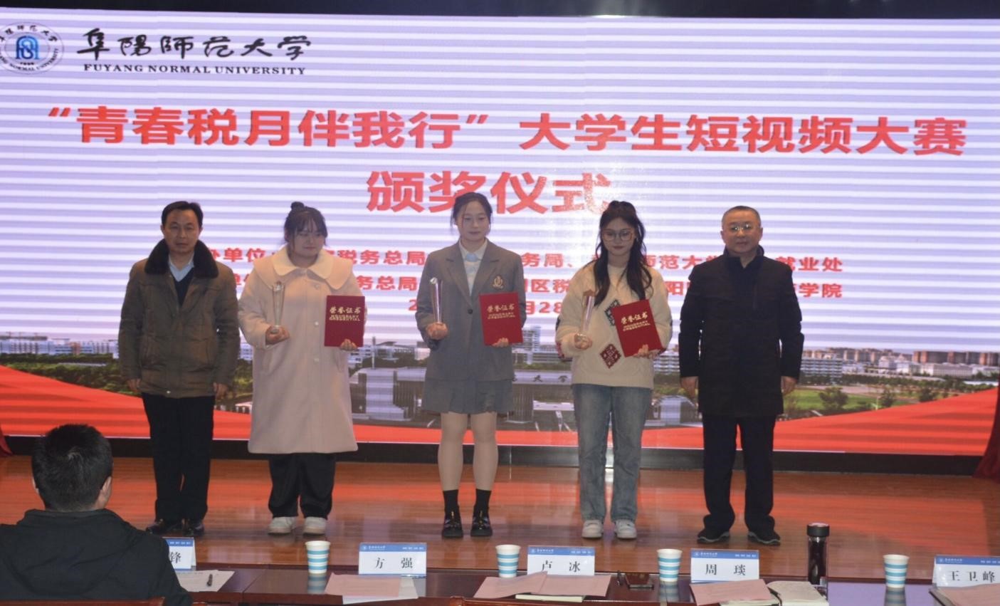 阜阳市税务局党委委员、总会计师卢冰,阜阳市税务局纳税服务科科长周琰,阜阳市颍州区税务局党委书记、局长王卫峰,阜阳市颍州区税务局第一税务分局分局长李岩岩,及我校招生就业处处长方强,我院院长朱剑峰,我院党委副书记王永刚,我院党务秘书康彬分别为一等奖、二等奖、三等奖、入围奖的团队颁发荣誉证书和奖杯。