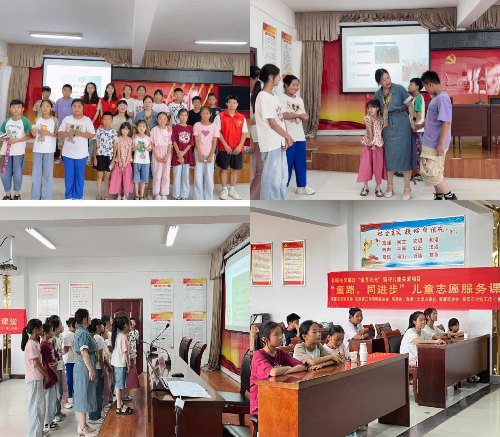 6月23日,由安徽省慈善总会联合阜阳市社会工作(者)协会开展的安徽省儿童服务与发展支持项目:阜阳市吴寨居“童享阳光”留守儿童关爱项目——“童路,同进步”儿童志愿服务课堂顺利开课。我院副教授王萍应邀为吴寨村20余名儿童做“小小志愿者,传达大爱心” 儿童志愿服务培训,我院硕士研究生朱燕、傅娜协同开展教学活动。