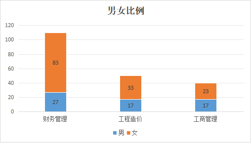 其中,男女数量差异最大和最小的专业分别是财务管理(男生27人,女生83人)和工程造价专业(男生17人,女生23人)。