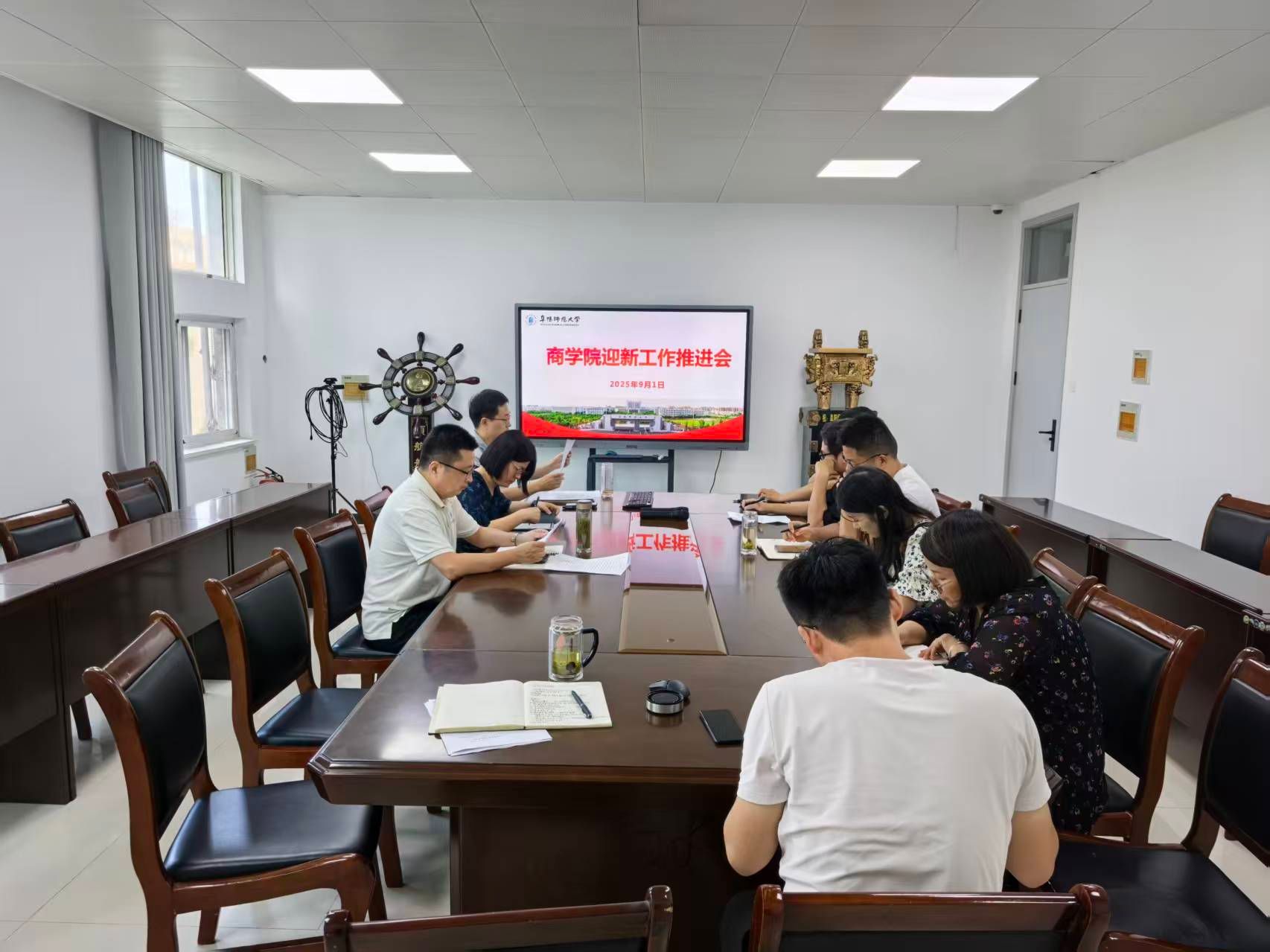 在“筹备精心”上发力,筑牢迎新工作“奠基石”。学院坚持“早谋划、细布置、严落实”,提前构建全方位迎新筹备体系,为迎新工作平稳推进夯实基础。8月20日,学院制定完成《商学院2025年迎新工作方案》;8月23日,完成新生辅导员助理选拔工作;8月26日,完成新生家校沟通平台的搭建;8月29日,召开2025年秋季学期期初学生工作例会,明确迎新各环节责任分工、时间节点与工作标准;9月1日,学院党委书记宋东锋主持召开迎新工作推进会,院长张雪梅、副书记王永刚及全体专兼职辅导员参加,进一步细化全链条工作方案,确保各环节高效协同。