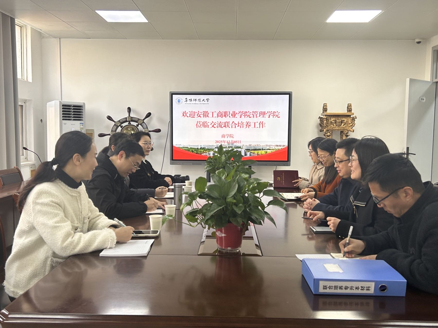 12月5日,安徽工商职业学院管理学院副院长倪伟率队来我院开展交流联合培养工作。学院党委书记宋东锋、院长张雪梅、副院长张克荣、教务秘书赵玉等出席座谈会。