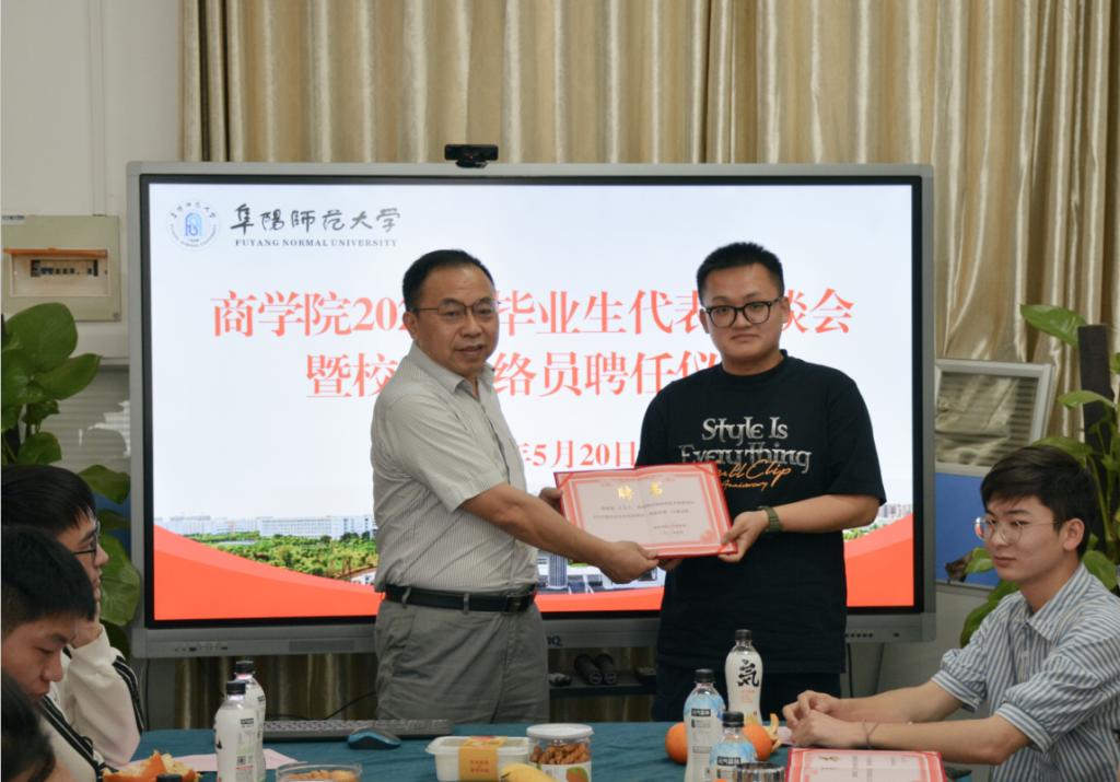 校友联络员聘任仪式环节,朱剑峰宣读了《商学院关于聘任2022届毕业生校友联络员的决定》,并为5位校友联络员代表颁发聘书。2018级工商管理专业1班的于春梅同学代表校友联络员发言,她表示,2022届校友联络员必将不负学院嘱托,持续关注母校发展,多方搭建沟通桥梁,全力支持校友工作,为师大的日新月异继续贡献自己的一份力量。