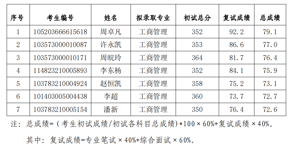 根据教育部《关于印发<2023年全国硕士研究生招生工作管理规定>的通知》(教学〔2022〕3号)、《关于做好2023年全国硕士研究生复试录取工作的通知》(教学司〔2023〕3号)和安徽省高等学校招生委员会 安徽省教育厅《关于做好安徽省2023年硕士研究生复试录取工作的通知》(皖招委〔2023〕4号)等文件精神,按照安徽省2023年硕士研究生招生录取工作会议要求、阜阳师范大学商学院2023年硕士研究生复试录取工作方案。现将我院2023年工商管理专业第1次调剂志愿全日制硕士研究生拟录取名单公示如下: