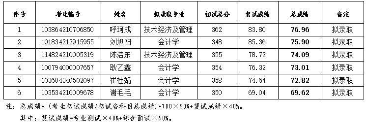 根据教育部《关于印发<2024年全国硕士研究生招生工作管理规定>的通知》(教学〔2023〕2号)、《关于做好2024年全国硕士研究生复试录取工作的通知》(教学司〔2024〕1号)和安徽省高等学校招生委员会安徽省教育厅《关于做好安徽省2024年硕士研究生复试录取工作的通知》(皖招委〔2024〕15号)等文件精神,按照安徽省2024年硕士研究生招生录取工作会议要求、阜阳师范大学商学院2024年硕士研究生复试录取工作方案,现将我院2024年工商管理学科调剂志愿全日制硕士研究生拟录取名单公示如下: