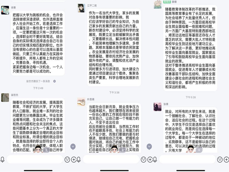 疫情期间,虽然我们没有机会回到学校聆听老师们的教诲,但是每一位同学都在家里认真学习各科视频讲义,思想上的学习也丝毫没有停滞,在各班级组织的讨论中,同学们这样发言到,特别是本次《习近平与大学生朋友们》专题报道集中学习,帮助我们端正了就业选择、认识了基层工作的重要意义、坚定了建设家乡的信心,同时大家还对共青团工作方法提出了各自的想法和建议。