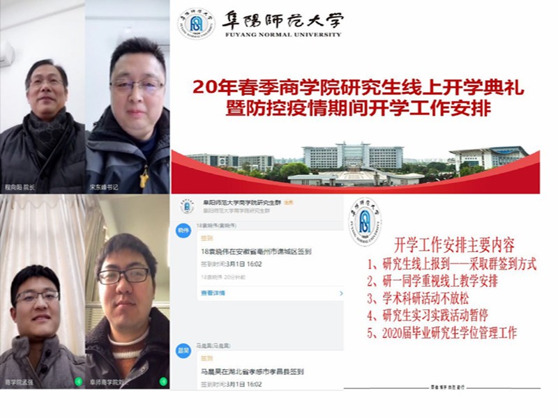 自新冠疫情发生以来,商学院党政领导、全体师生坚决贯彻执行上级和学校疫情防控和线上开学工作要求,综合采取多项硬核措施切实保障全体师生生命健康安全和教学运行。同时,商学院研究生全体导师及在籍144名研究生精心筹划、用心推进、细心操作、耐心引导,用“四心行动”扎实做好研究生线上开学工作,确保了3月2日线上教学工作顺利进行。