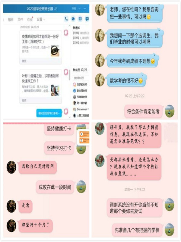 学院积极应对疫情带来的工作困境,迅速建立“网络战疫”新模式,通过打造电话、电子邮箱、视频、软件小程序、微信、QQ等线上网络信息平台,每日转发各级各类关于疫情防控期间就业工作的文件、通知,及时“空中宣讲”国家关于控疫情、促就业的相关政策和相关企业事业单位信息,确保招聘信息服务“送上门”;针对特殊时期毕业生就业求职过程中出现的压力、焦虑等实际问题,学院设立了“考研资讯”、“职场指导”、“就业招聘”等线上平台模块专栏,做好线上职业生涯规划、在线指导、“一对一”咨询,开启线上就业帮扶通道;学院主动联系用人单位,通过与合作单位开展就业信息推介、线上专场招聘与就业指导等系列活动,确保实现信息发布、空中招聘、就业指导、就业服务等线上工作的一体化完成,切实保障毕业生的身体健康和就业渠道。