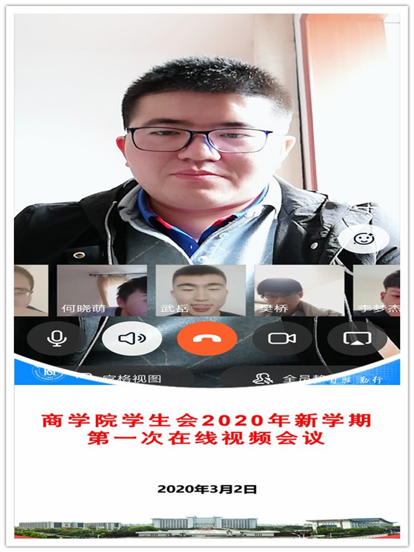 全校正式线上教学的第一天,商学院分团委立即组织学生会全体干部召开新学期第一次视频工作会,研究布置疫情防控期间学生会的具体工作任务。会议要求,在此非常时期,每个班级里的学生会干部要主动行动起来,积极带动并配合各班班长、团支书形成高效的联动机制,全面了解居家学生的身体状况、学习情况以及思想动向,切实发挥好桥梁纽带作用;还对学生会原定3、4月份开展的“青马微课”、“雷锋精神宣传月”、“未来职业规划大赛”、“挑战杯”等活动进行了重新安排,鼓励学生会干部在活动内容、活动形式上结合当前实际加以工作创新,引导广大学子充分利用线上平台扎实推进各项进程。