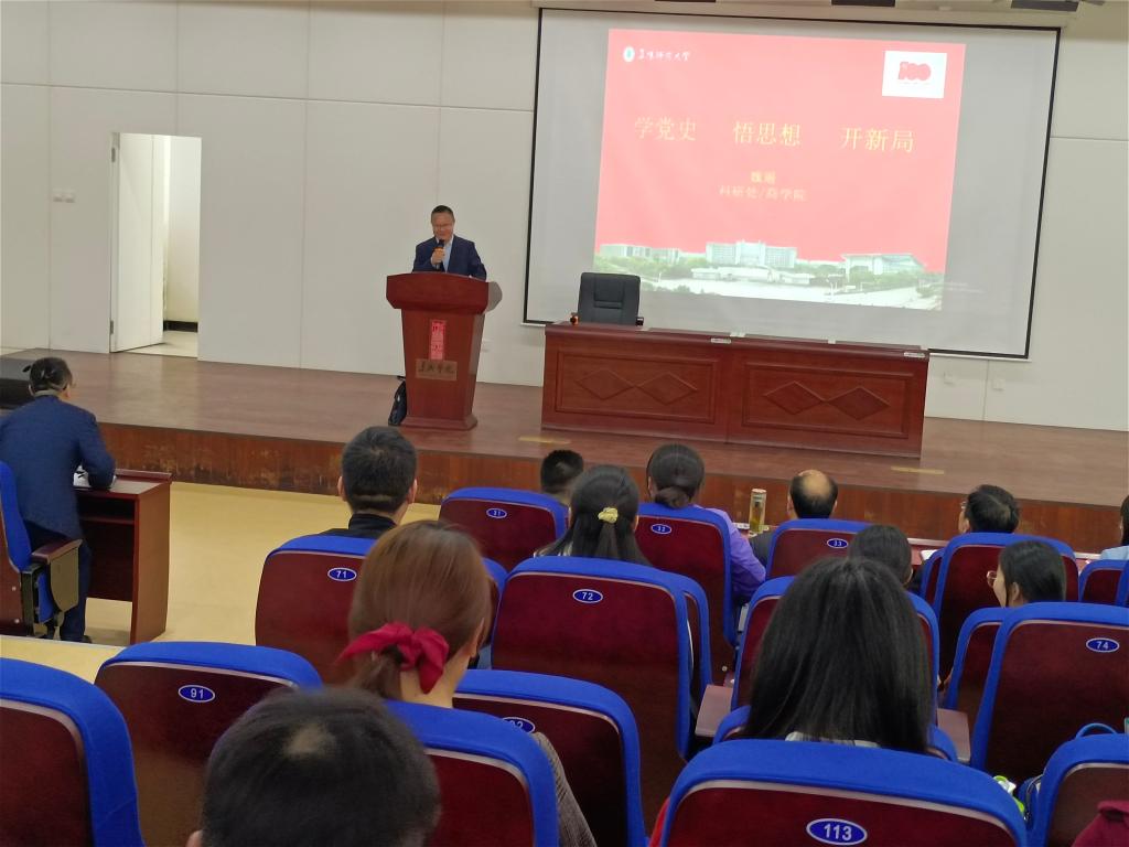 按照校党委统一安排,4月28日下午,校党委党史学习教育理论宣讲团走进商学院,由党史学习教育宣讲团成员、科研处副处长魏遥教授作题为《学党史 悟思想 开新局》的宣讲报告。商学院全体教职工参加报告会。