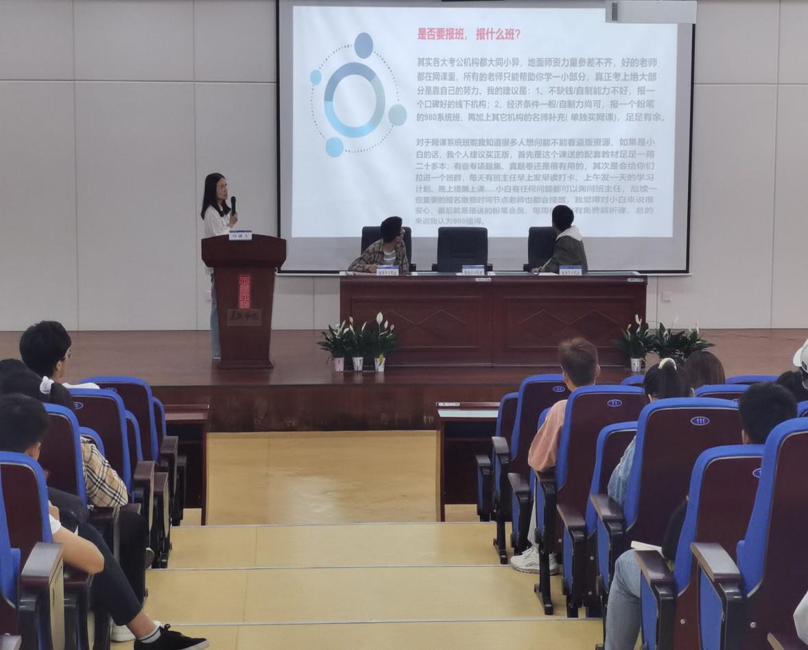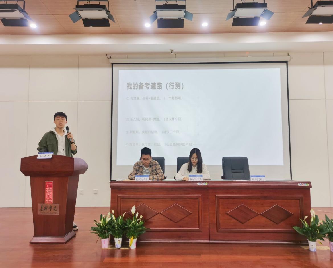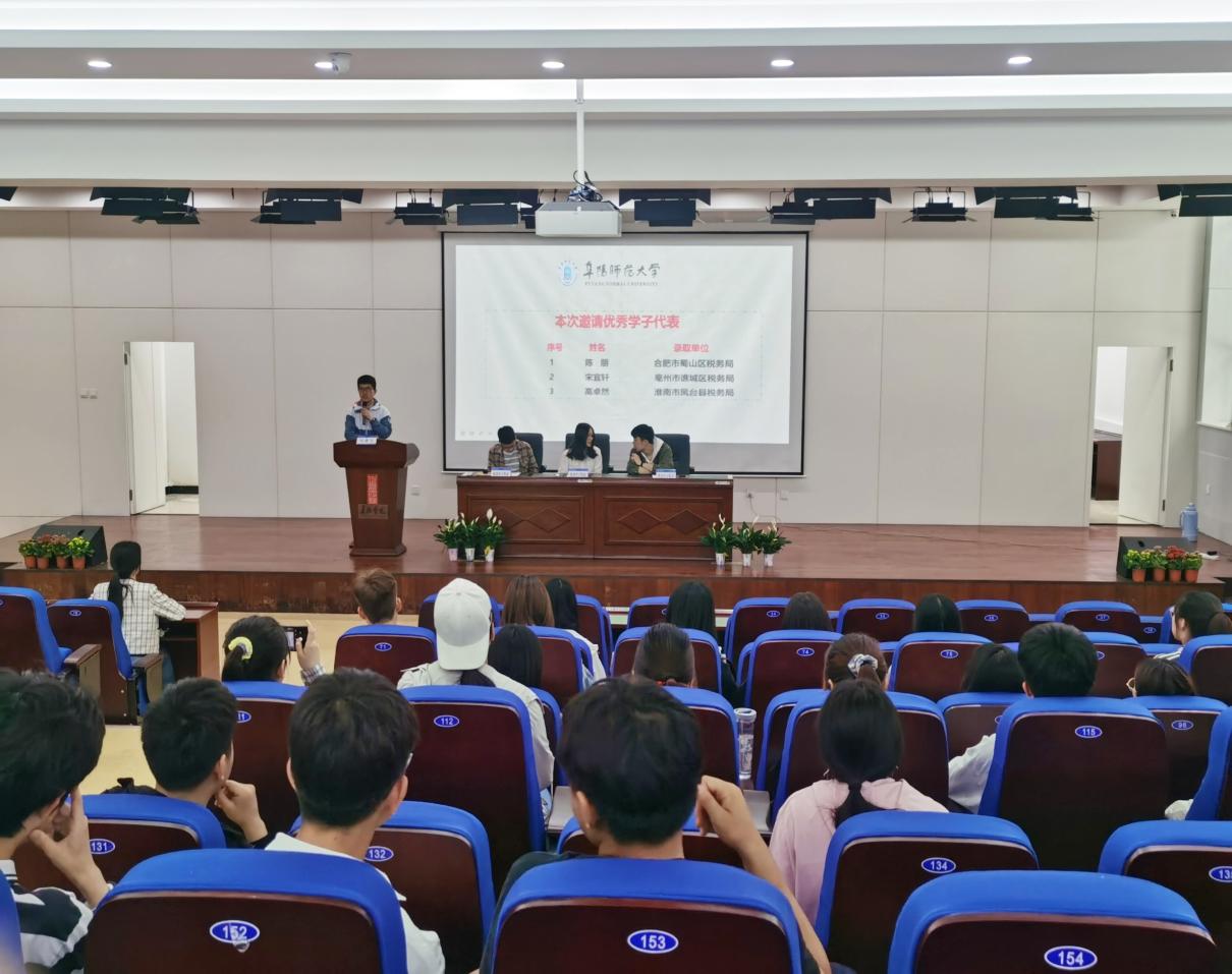 会上,应邀宣讲的3名同学分别从岗位选择和信息搜集、行测备考方略、申论及复试技巧等不同方面进行了深入细致地经验分享。考取合肥市蜀山区税务局的陈朋同学从“是什么”“为什么”以及“怎么做”三个方面系统地对公务员考试流程以及信息搜集等环节作了详细阐述,他还通过自身备考过程中的现实经验,勉励与会同学在备考过程中不要有过多的杂念,一旦明确了自身职业发展追求便要全身心地投入其中;考取亳州市谯城区税务局的宋宜轩同学以《行测是怎么炼成的》为主题,将自己8个月的备考期划分为“地基期”“渐入期”“稳健期”“攻坚期”四个阶段,并以原题再现的方式现场展示了解题策略,为广大学生提供了具体的方法论指导;考取淮南市凤台县税务局的高卓然同学围绕“关于国考”“关于备考”“关于面试”三方面对国考的关键过程进行了系统介绍,并重点针对报考选择问题,提醒学弟学妹们要结合自身的学习习惯、家庭状况以及个人备考进度来进行合理选择,切忌盲目跟风。
