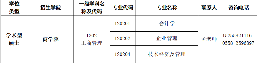 我院 2020 年全日制1202(工商管理)学术型硕士研究生接收调剂考生。具体调剂政策以2020年全国硕士研究生招生录取工作会议精神为准。为方便有志于调剂到我院工商管理硕士研究生的考生,现将拟接收调剂专业公告如下: