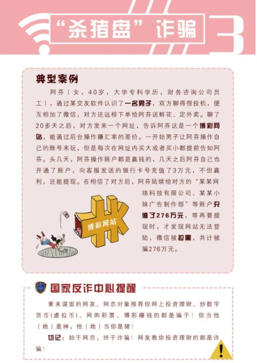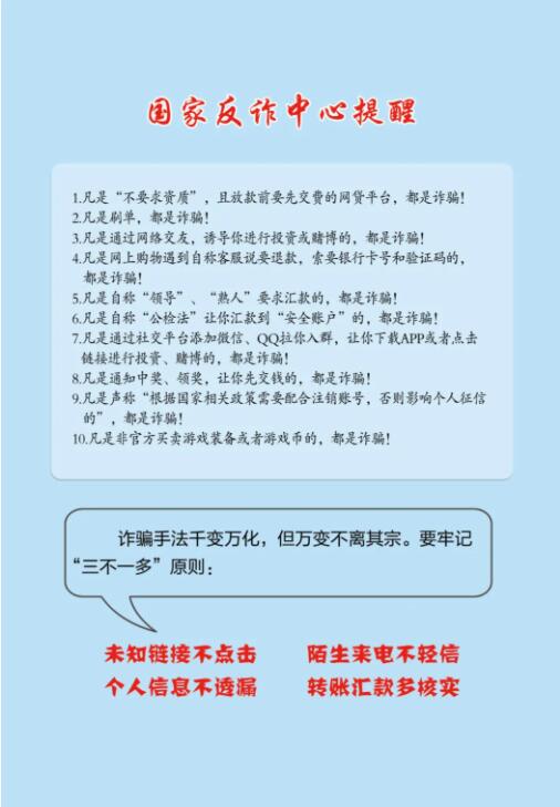 为进一步扩大反诈宣传覆盖面,提高广大群众防骗意识,国家反诈中心制作了《防范电信网络诈骗宣传手册》,向广大人民群众介绍了十种常见的电信网络诈骗类型,揭批了诈骗犯罪手法、解析了典型案例,同时进行了防骗提示。下一步,将以《防范电信网络诈骗宣传手册》为载体,通过新闻宣传报道、新媒体平台、组织线下宣传活动等方式向全社会开展广泛的防骗宣传。