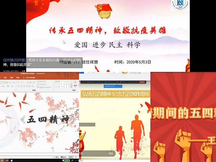 为激励和引导广大团员青年大力弘扬以爱国主义为核心的伟大民族精神,坚定“四个自信”,五四青年节期间,我院团委结合疫情防控,用视频云讨论、团课宣讲、PPT创作等多种方式,开展纪念五四运动系列线上主题团日活动。