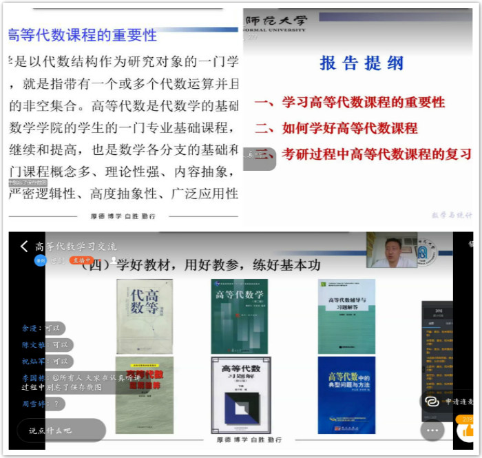 6月10日下午,学院举办了“关于高等代数课程的学习方法及考研过程中的复习对策”讲座,由代数教研室主任唐剑老师主讲,来自学院2017、2018、2019级的500余名同学通过钉钉直播聆听讲座。期间,唐剑老师就学习高等代数课程的重要性、如何学好高等代数课程以及考研过程中高等代数课程的复习对策进行了全面解读,他以专业权威的论述向同学们传授了高等代数这一考研必考科目的学习方法以及备考策略,在帮助低年级同学打牢专业知识基础的同时也为高年级同学备战考研提供了正确的复习思路与学习技巧。