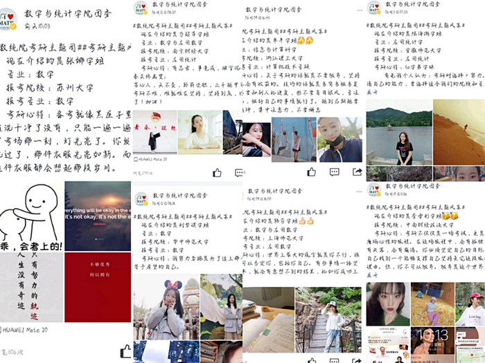 考研学子风采展示对已经考取硕士研究生的毕业生来说是一种荣誉,对憧憬着考取研究生的非毕业班同学来说则是一种激励。为此,学院于6月8日至6月14日举办线上考研学子风采展示活动,在一周内通过学院官方网络新媒体平台展播考研学子风采,活动期间所展示的一段段激励的话语、一张张精彩的图片,记录着考研生活的艰难与充实,也流露出考研学子自信自强的精神品质。本次活动在增强了考研学子自豪感荣誉感的同时也鼓舞了下一届同学的备考士气,在学院内进一步营造了浓厚的考研氛围。