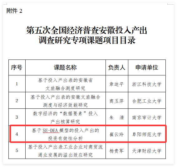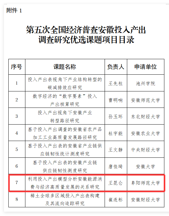 近日,安徽省统计局正式公布2025年度安徽省统计局第五次全国经济普查安徽投入产出调查研究课题项目拟立项名单,我院王昆仑博士获批优选课题项目1项、崔云玲博士获批专项课题项目1项。