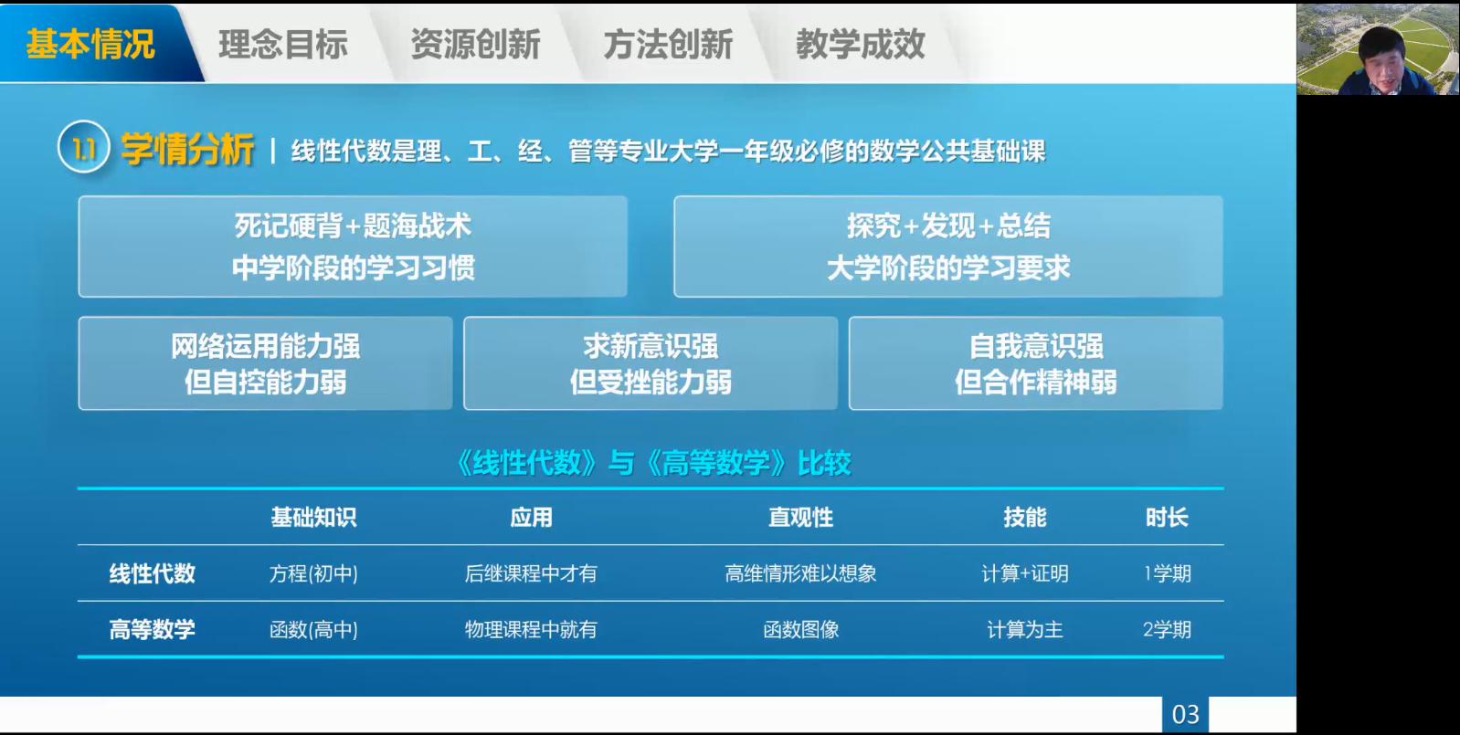报告中,陈建龙从线性代数课程的学情及痛点问题的分析出发,详细介绍线性代数课程的基本情况、理念目标、资源创新、方法创新和教学成效等五方面内容。特别在资源和方法创新中提出了三融入的课堂教学方法(即融入课程思政元素、融入数学建模思想和融入学术前沿成果),通过线上与线下混合式教学,营造师生学习共同体,达到教学效果最大化。