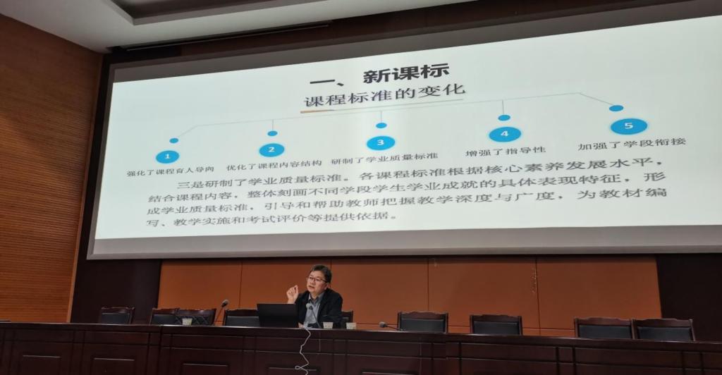 报告中,王教授围绕“新课程、新理念、新教学”,深入浅出的阐明新课程改革的整体思路,介绍了如何将立德树人的根本任务落实到中小学课堂教学中去。针对2022年版的义务教育课程方案和课程标准相对老版本的新变化做了介绍,并为大家详细解读新课标的一个核心、两条路径、三有目标、四大突破、五项政策等。他强调,构建新型学习中心课堂是创立新型教学的最直接的抓手,是实现核心素养落地的最实质的切入点。