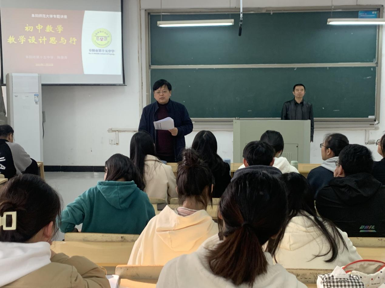 为提高师范专业毕业生和学科教学(数学)专业研究生的职业成长,深入了解中学数学课堂教学,11月22日下午,我院邀请阜阳市第十五中学陈景涛老师为2024届数学与应用数学(师范)专业毕业生、2023级学科教学(数学)专业研究生以及部分教育实习指导老师作题为“初中数学教学设计思与行”的专题报告,报告会由学院院长盛兴平主持。