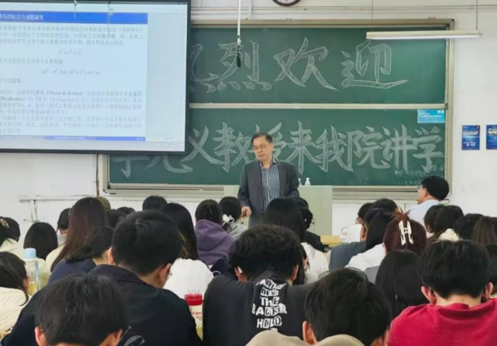 首先,李教授在躬行D楼411教室为学院2022级数学与应用数学专业本科生做了题为“浅谈数学研究中的几个猜想”的科普报告,李教授介绍了孪生素数猜想、哥德巴赫猜想和费马猜想等数学领域的著名猜想的历史渊源以及最新研究进展。最后,李教授一一回答了同学们提出的问题并给同学们提出数学学习方面的一些建议。