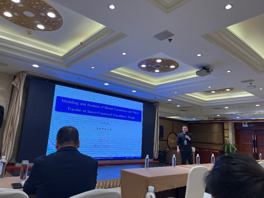 会议期间,我院赵金虎博士受邀作题为“Modeling and analysis of mixed convection and heat transfer of space-fractional viscoelastic fluids”的学术报告。赵金虎针对平板上粘弹性流体的混合对流边界层流动和传热问题,在本构关系和修正傅里叶定律中分别采用了Riemann-Liouville的空间分数阶导数,建立了具有非均匀边界条件的非线性耦合边界层控制方程,证明了有限体积的离散化格式在一定条件下是稳定的,并给出了数值解的收敛性证明。