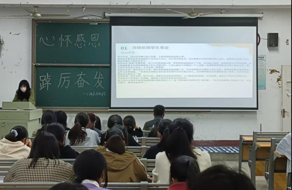 开展“心怀感恩·踔厉奋发”主题班会。3月份以来,学院各班级召开“心怀感恩·踔厉奋发”主题班会,各班紧紧围绕主题,通过宣传感恩励志教育主题月系列活动、讲述身边的励志故事、观看励志短视频、受助学生发表感言等多种形式引导全体学生好好学习,争先创优,践行感恩行动。