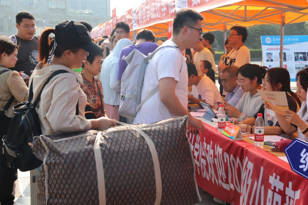 精心准备的暖心大礼包,文化袋、校徽、地图、口罩、矿泉水等让新生格外开心。身穿绿色文化衫的志愿者一刻不停地接待着新生同学,为他们指引路线、搬运行李,并向新生们介绍学院的基本情况和丰富的大学生活。