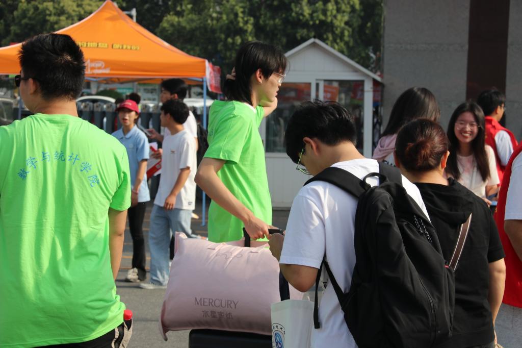 9月8日一大早,西湖校区数学与统计学院迎新现场,鲜艳的欢迎条幅、飘扬的红色气球、精心设计的展板、暖心大礼包……洋溢着喜庆欢乐的氛围。“同学,数学在这边” “同学,我来帮你拿”“同学,这是你的礼包”,迎新志愿者热情周到,主动服务,新同学有序报到、确认入学信息、办理住宿手续等。