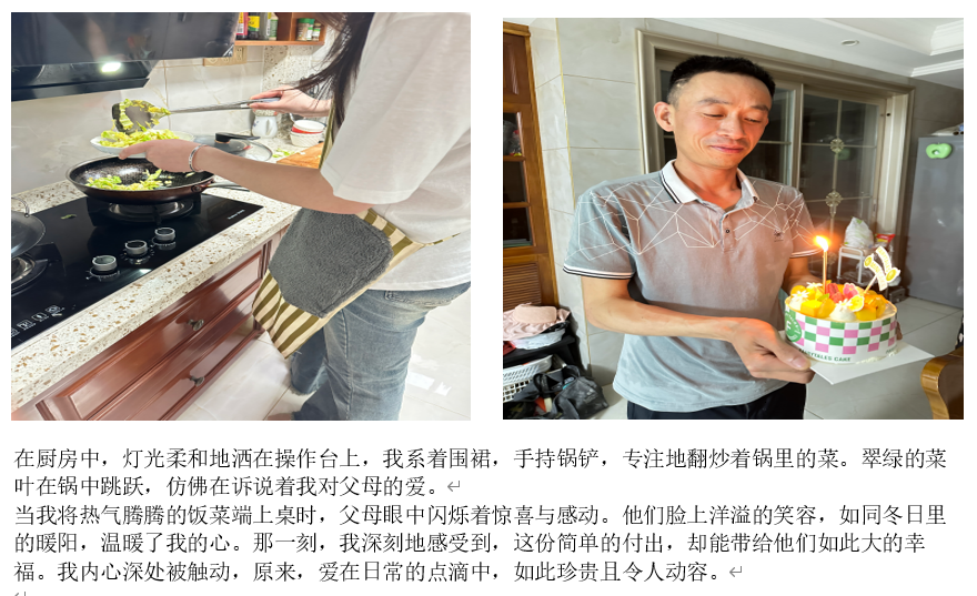 5月1日至6日开展的"爱在当下:家庭情感唤醒计划"劳动节主题活动,创新设计了“认知-体验-表达”的心理育人路径。在“孝心行动”中,学生们通过烹饪佳肴、整理家居等实际行动表达感恩;“时光对话”环节引导探寻老物件背后的劳动记忆;“创意拼贴”则让旧物焕发新生,艺术化记录家庭温情。一张张父母笑脸的照片、一段段真挚的文字,展现了劳动与爱的双向流动,有效提升了学生的感恩意识与家庭归属感。