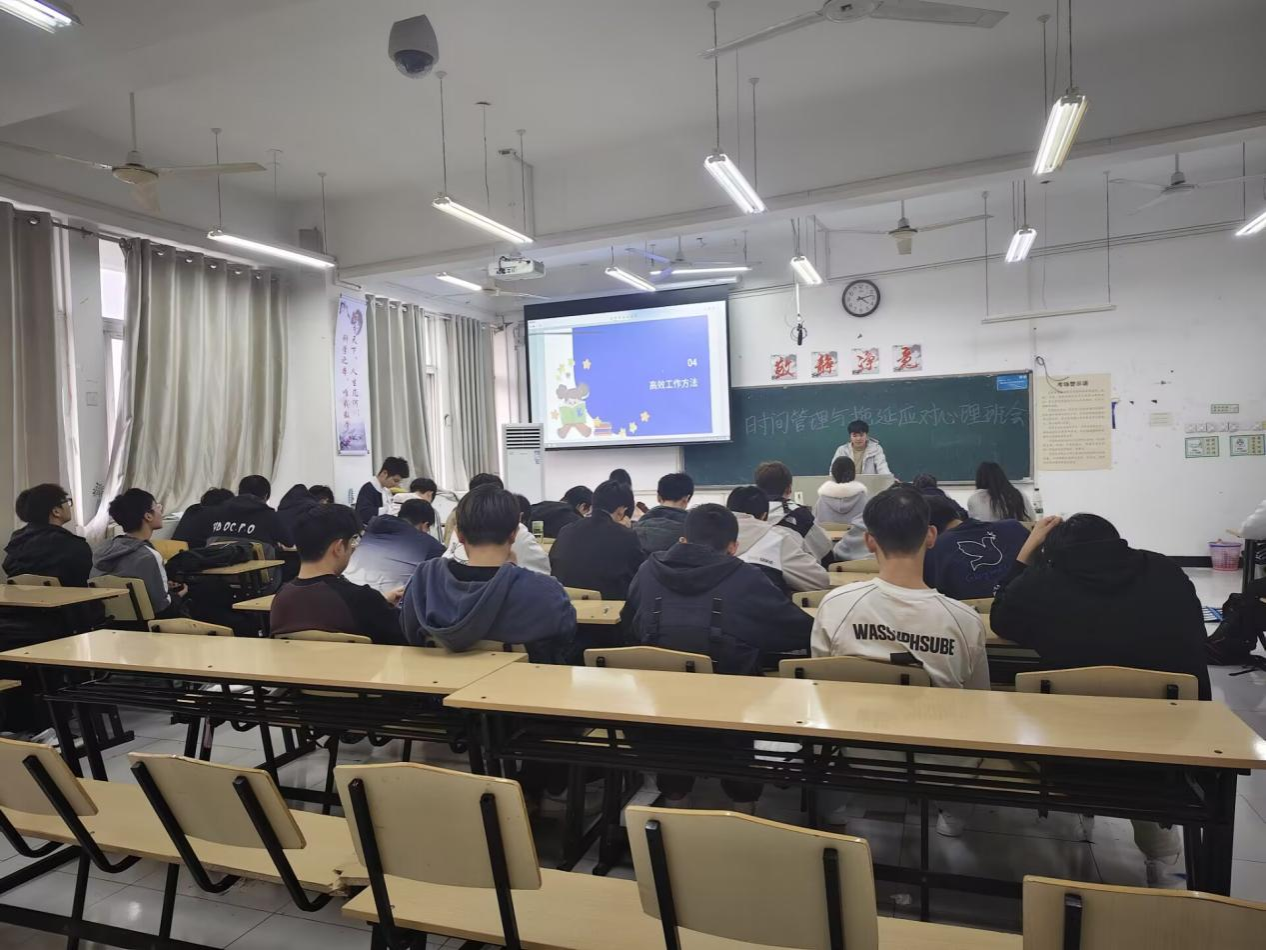 善规划,克拖延——破解时间管理局。聚焦大二学生学业压力下的时间管理难题,“时间管理与拖延应对”主题班会精准发力。心理委员介绍时间规划方法论,结合拖延成因分析图表,直观呈现拖延心理的形成机制。现场演示高效时间管理工具操作流程,辅以真实案例引导学生对照剖析自身问题,掌握科学管理技巧。互动实践环节中,各班自行策划的个人任务规划、小组效率比拼等活动,让学生在实践中深化认知,有效提升任务执行力与时间利用效率,以积极心态平衡学业与生活。