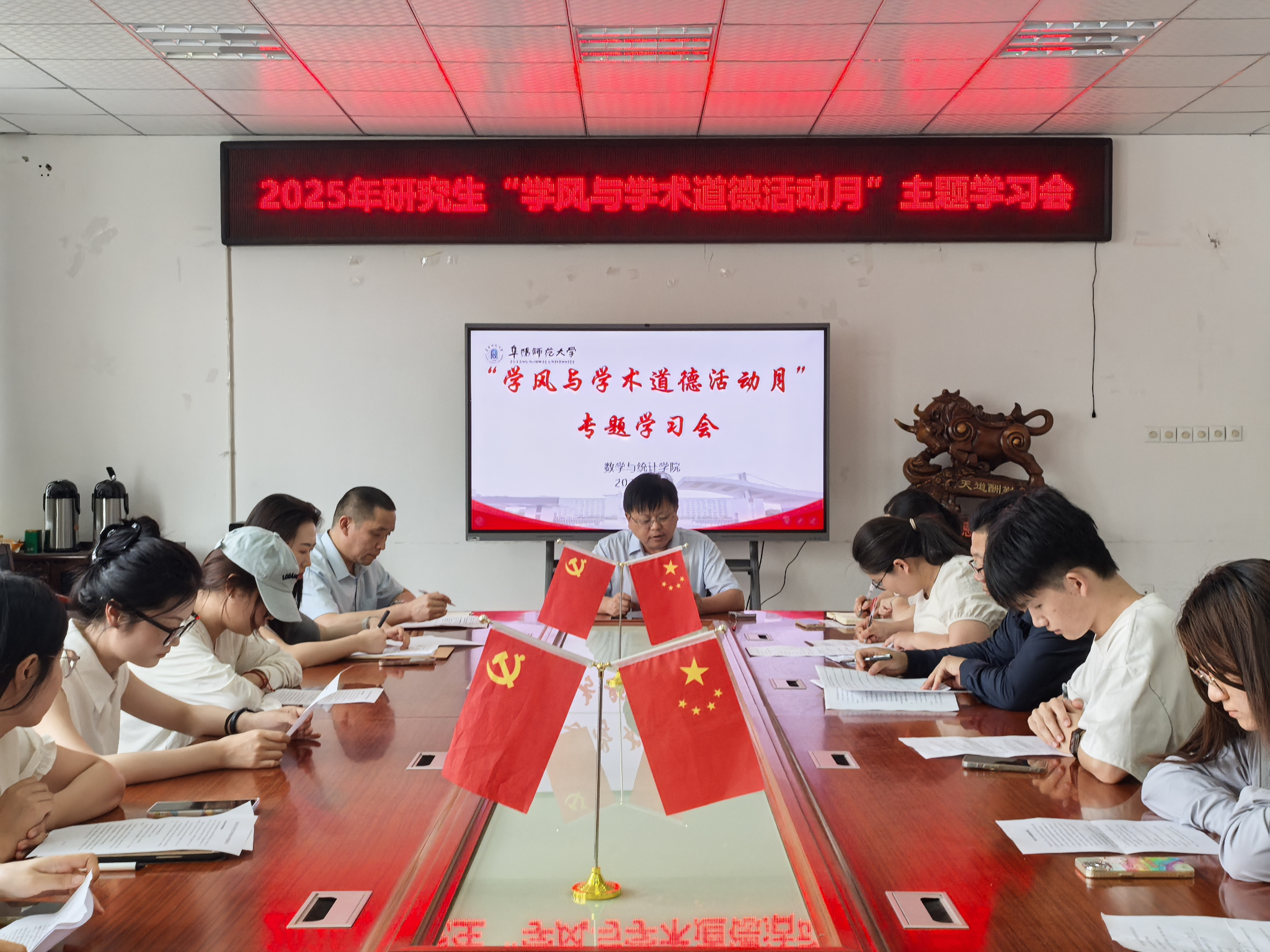 在考风考纪教育与学风建设专题研讨环节,与会师生集中深入学习《学位论文作假行为处理办法》(教育部34 号令)、《高等学校预防和处理学术不端行为办法》(教育部 40 号令)和《阜阳师范大学学生违纪处分实施办法(2025 年修订)》等重要文件。在热烈的研讨氛围中,师生们围绕文件精神,展开充分交流,进一步深化了对学风建设与学术道德的理解和认识。