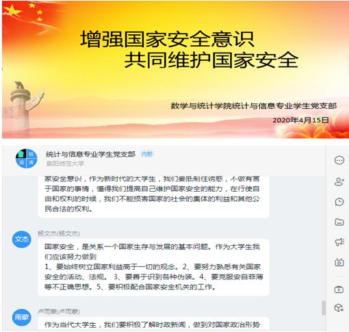 围绕“坚持总体国家安全观,统筹传统安全和非传统安全,为决胜全面建成小康社会提供坚强保障”这一主题,各党支部开展国家安全教育主题党日活动。各党支部组织全体党员线上观看《总体国家安全观》《生物安全微动漫》《总体国家安全观公益宣传片》《五分钟读懂国家安全法》《国家安全普法宣传教育之<国家安全法>》《国家安全谱法宣传教育之<反间谍法>》等相关视频宣传资料和观摩国家安全教育网络专栏;各党支部书记通过钉钉直播、QQ群等平台进行国家安全内容的详细介绍,分析当前国内外安全形势,以及社会组织和公民个人在维护国家安全方面的义务。