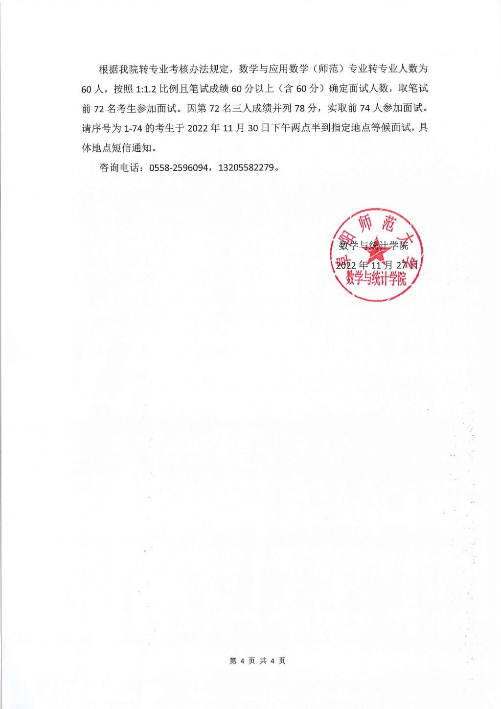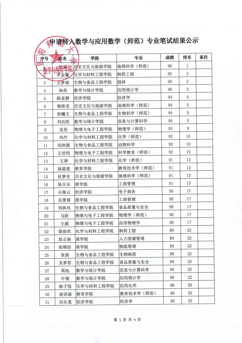 2022年申请转入数学与应用数学(师范)专业笔试结果公示