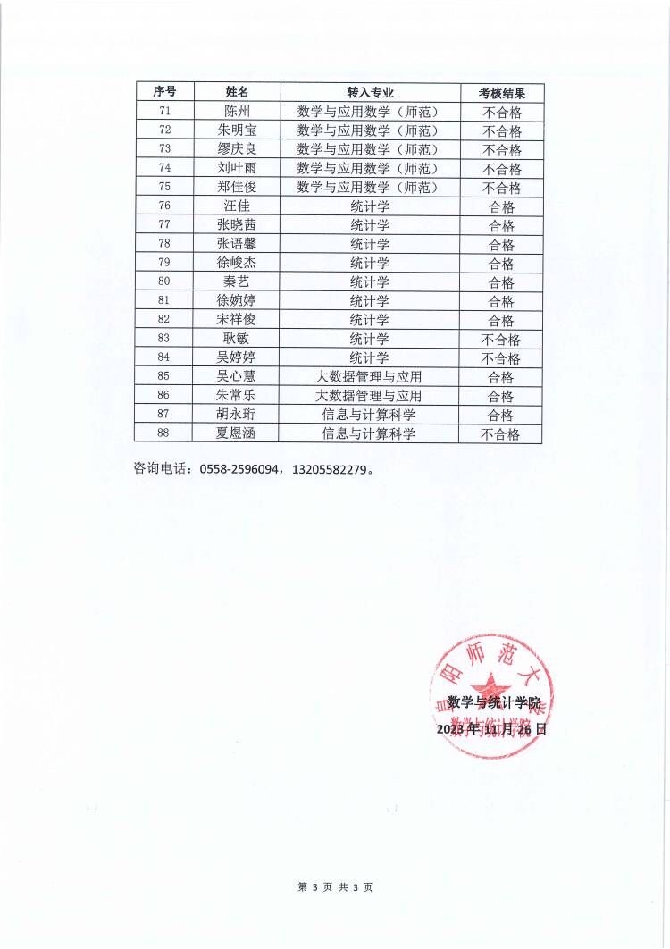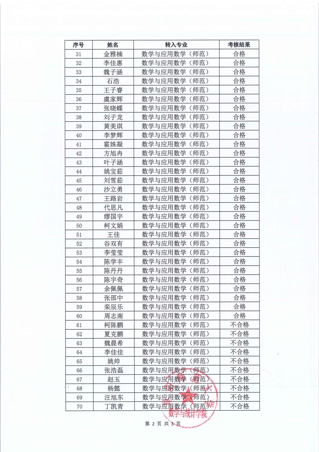 第二志愿申请转入数学与统计学院最终考核结果公示